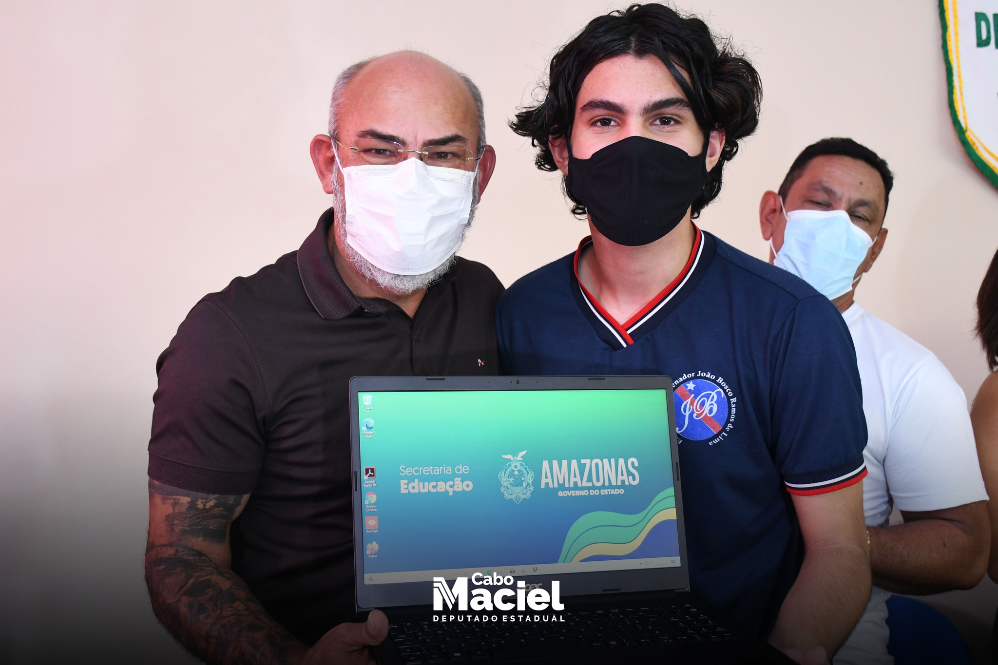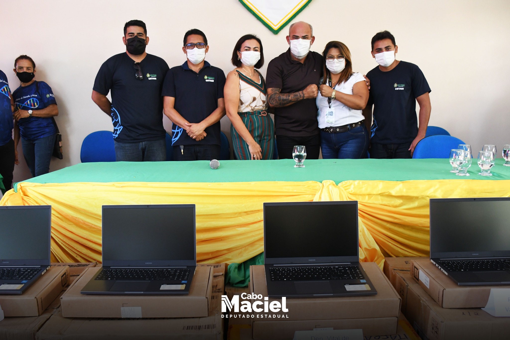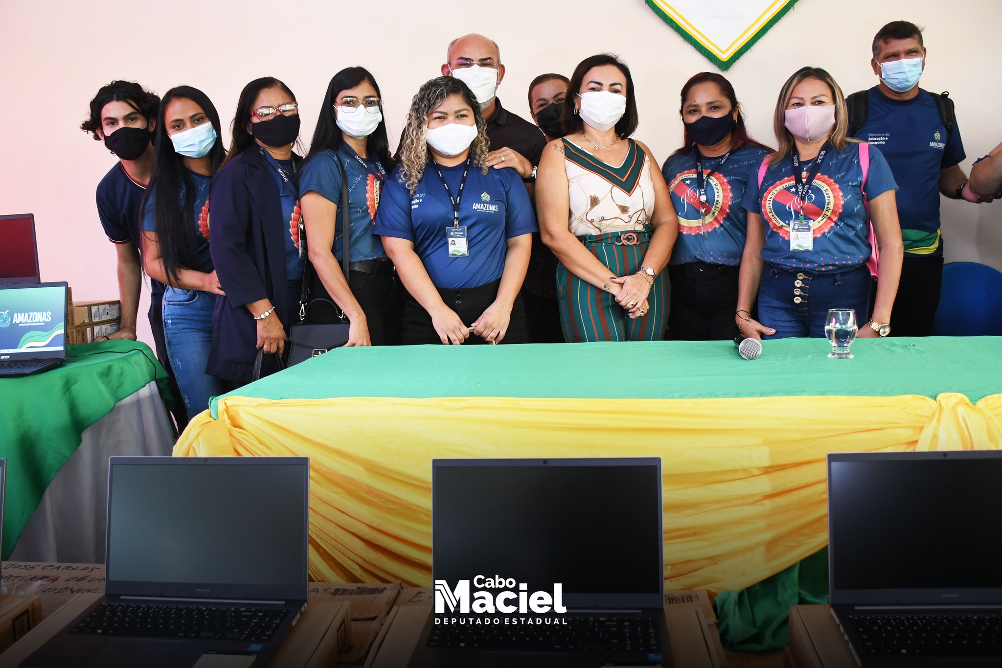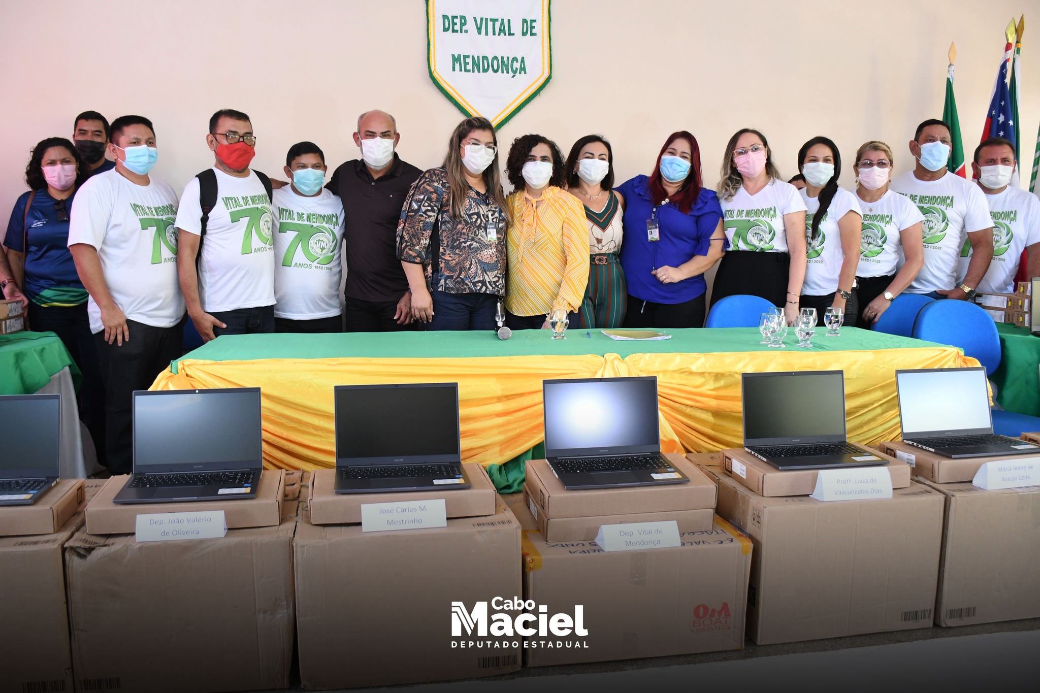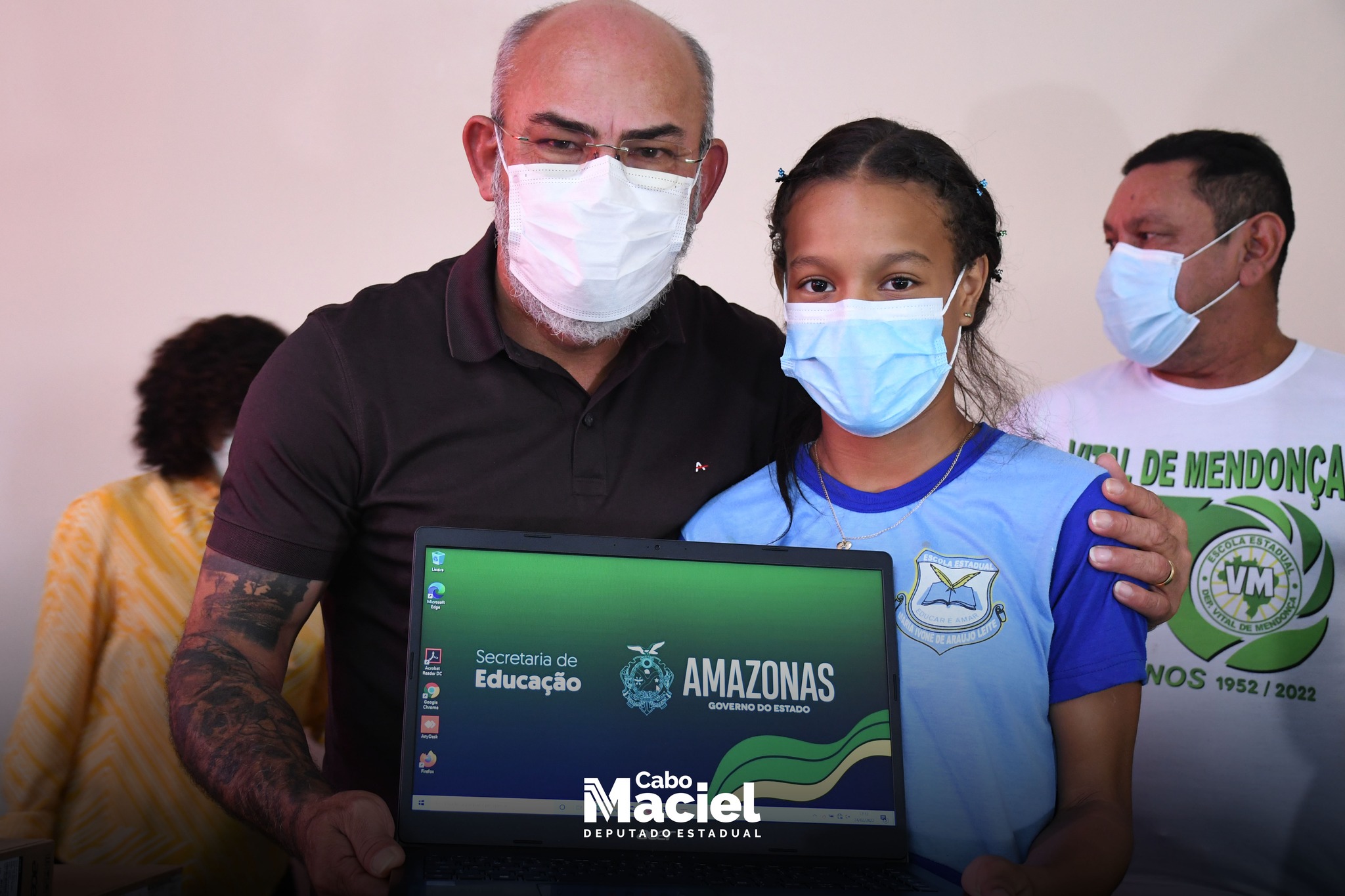 Na manhã desta quinta-feira (24/02), o Deputado Cabo Maciel, acompanhou ao lado da minha esposa Soraya Maciel e sua filha Karla Géssica, na Escola Estadual Dep. Vital de Mendonça, da solenidade de entrega de 100 Notebooks, fruto de uma emenda parlamentar de sua autoria, por meio da Secretaria de Educação (Seduc), no valor de 1.050.000,00 milhão, que contemplou além de 10 escolas estaduais em Itacoatiara outras 11 unidades no interior.
