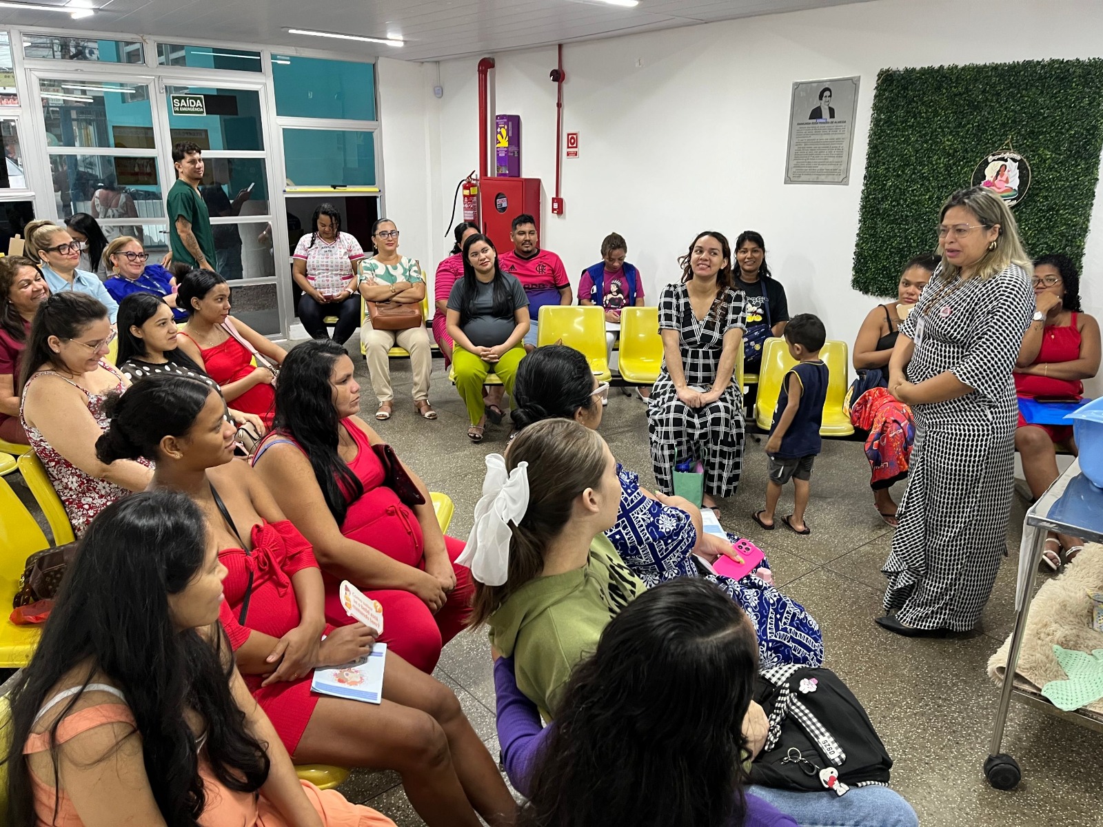 Em torno de 15 gestantes e parcerias participaram do encontro do Banzeiro Materno no auditório da USF Rosa Almeida, ao lado de profissionais de saúde da unidade. Nas reuniões mensais do grupo, as integrantes conhecem melhor o processo de gestação, parto e puerpério por meio de rodas de conversa com equipes multiprofissionais de saúde.