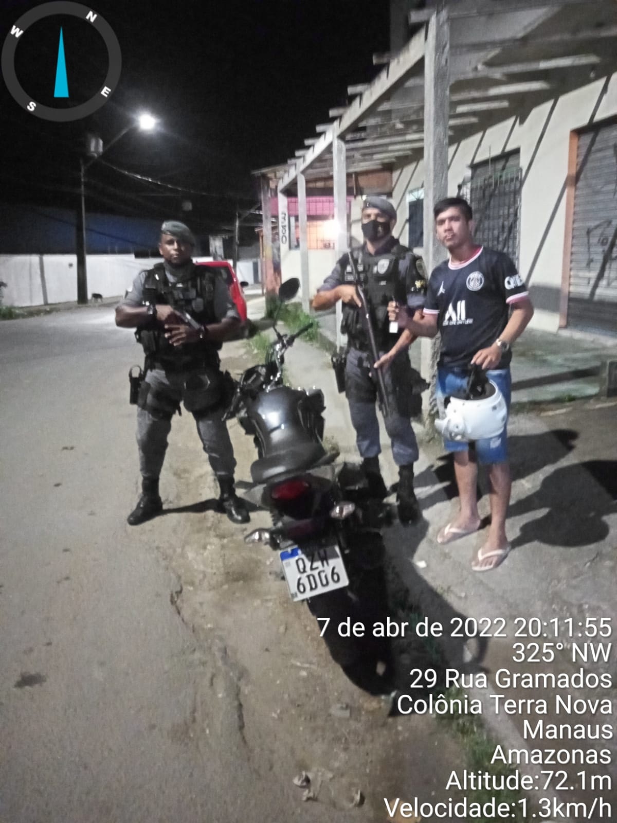 A equipe policial na viatura 7226 fazia patrulhamento em ruas da comunidade, por volta das 20h, quando foi acionada por um homem, de 22 anos, relatando que sua motocicleta, modelo Honda Titan, de cor cinza e placas QZW6D06, havia sido roubada por dois homens vestidos de roupa social, usando máscaras e arma de fogo.