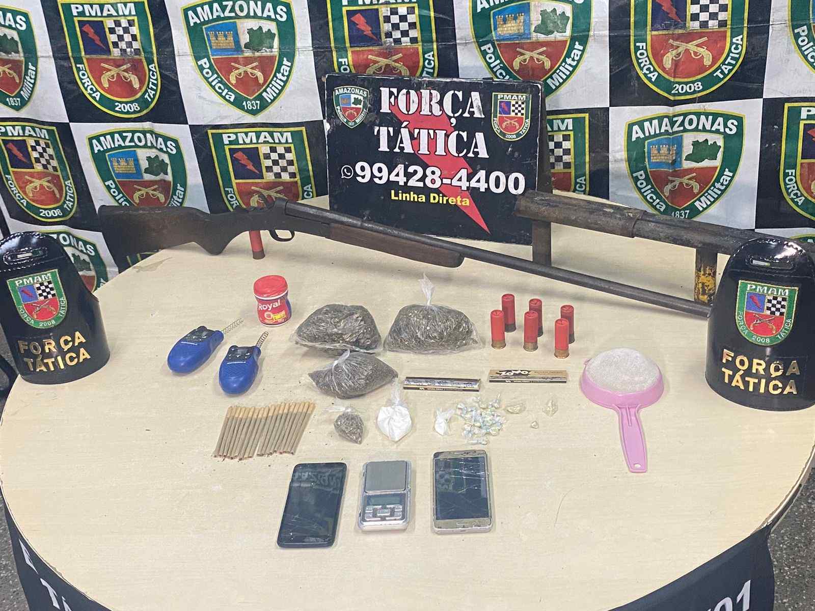 Na busca pessoal, foram encontradas duas armas, sendo uma espingarda calibre .16, numeração 3354; e uma arma de fabricação caseira calibre .12, com sete munições do mesmo calibre intactas. Foram apreendidas ainda 20 trouxinhas de material entorpecente similar a oxi; uma porção pequena, três porções grandes e e 18 cigarros de maconha; dois rádios comunicadores; dois celulares; e uma balança de precisão.