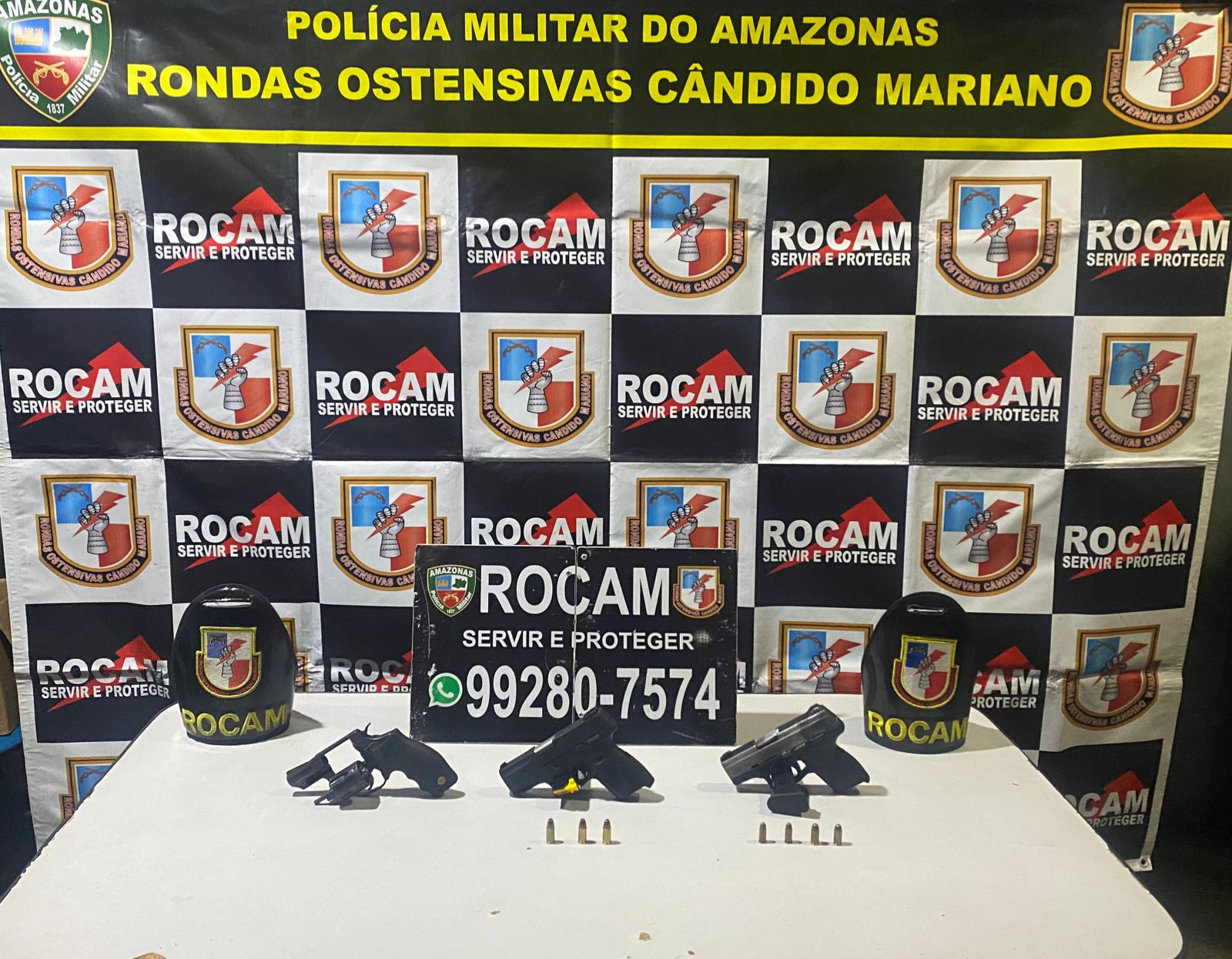 Policiais militares das Rondas Ostensivas Cândido Mariano (Rocam) apreenderam, na noite de ontem (11/03), um adolescente, 17, com três armas de fogo e munições, na rua 15 de Julho, bairro Santa Etelvina, zona norte de Manaus.