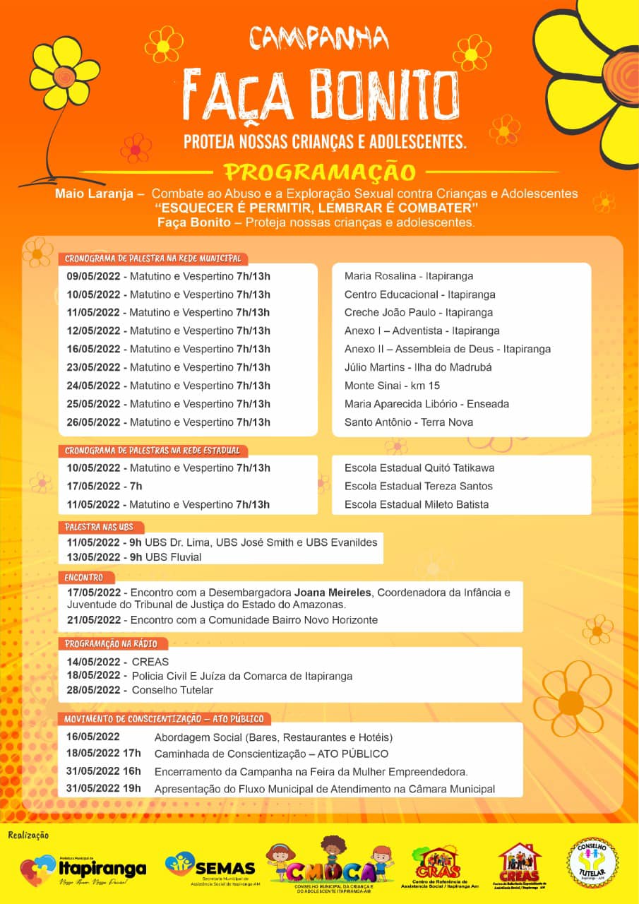 Neste mês, a rede de proteção da criança e do adolescente da Prefeitura de Itapiranga, juntamente com demais entidades de proteção do município, trabalharão em conjunto, com palestras em escolas, UBS’s, entre outras repartições.